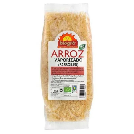 El Arroz Vaporizado (Parboiled) está parcialmente cocido con vapor de agua y posteriormente secado al vacío. Este proceso ayuda a que el arroz contenga menos cantidad de hidratos de carbono que los otros arroces. Gracias a esta característica, su cocción es más rápida que en la del resto de arroces ecológicos de Biográ y siempre se mantiene al dente.