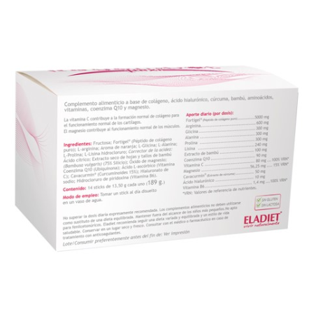 Por stick : fortigel 5000mg, arginina 600mg, glicina 300mg , alanina 300mg , prolina 300mg, lisina 240 mg, bambú (extracto) 100mg, coenzima Q10 90mg, vitamina C 80mg, magnesio 56.25mg, cavacurmin 50mg, ácido hialurónico 10mg, vitamina B6 1.4mg.
